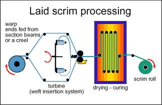 oder zwischen den Kettfäden. Das Gelege wird sofort mit einem Klebstoffsystem imprägniert, um die Fixierung der Längs- und Querfäden zu gewährleisten.